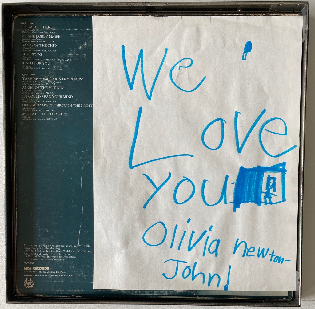 Olivia’s deeply principled and remarkably generous philanthropic work for the health of the Earth and all life on it are the reasons why I have continued to admire her throughout my adult life. In 2006, I had the profoundly fortunate opportunity to meet her when she performed in the small city where I resided for 35 years. She was exactly as I had always imagined her to be, gracious and genuine. Backstage, after the show, she talked with me as if I had been a part of her history as much as she had been a part of mine. She signed my Grease poster from 1978 and my Let Me Be There album from 1973. I presented her with a gift from my seven-year-old daughter, the drawing below. Tears formed in the corners of Olivia’s eyes. She shared that she too had just one little girl, and her little girl was all grown up now, and she loved her so dearly that she could not accept my daughter’s drawing. She explained that one day, that piece of paper would mean far more to me than I could possibly know that day, and she asked me to save it and treasure it. I heeded her advice and tucked it inside of my autographed album. Upon Olivia’s passing, my daughter was “all grown up.” I told her the story and revealed the treasure inside of the album that had been framed on our living room wall for sixteen years. I placed the record on our turntable. Tears streamed from my eyes as we sang along to every track and I experienced the unmatched joy of hearing the pops and crackles exactly as I had heard them 40 years earlier.
