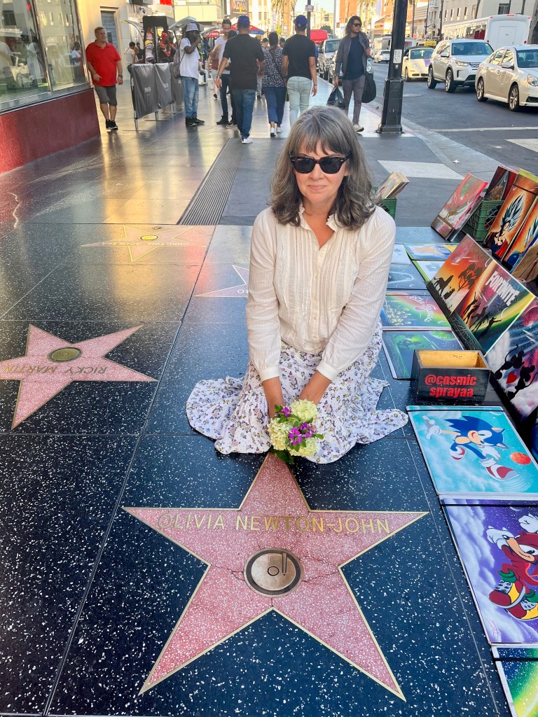 In 2022, one month after Olivia departed from this world, I traveled to Los Angeles to pay proper tribute alongside my dearest friend from my years of living there–the one who first took me to the majestic rocks of Point Dume at Zuma Beach in Malibu, the spot from which Gene Kelly’s character first appears in Xanadu. She and I lunched at the beach that day and reminisced about Olivia–she and my friend had once been neighbors in Malibu. We cut flowers from my friend’s garden and delivered them to Olivia’s star on the Hollywood Walk of Fame. And of course, we listened to the Xanadu soundtrack as we travelled down Sunset from the beach to Hollywood.